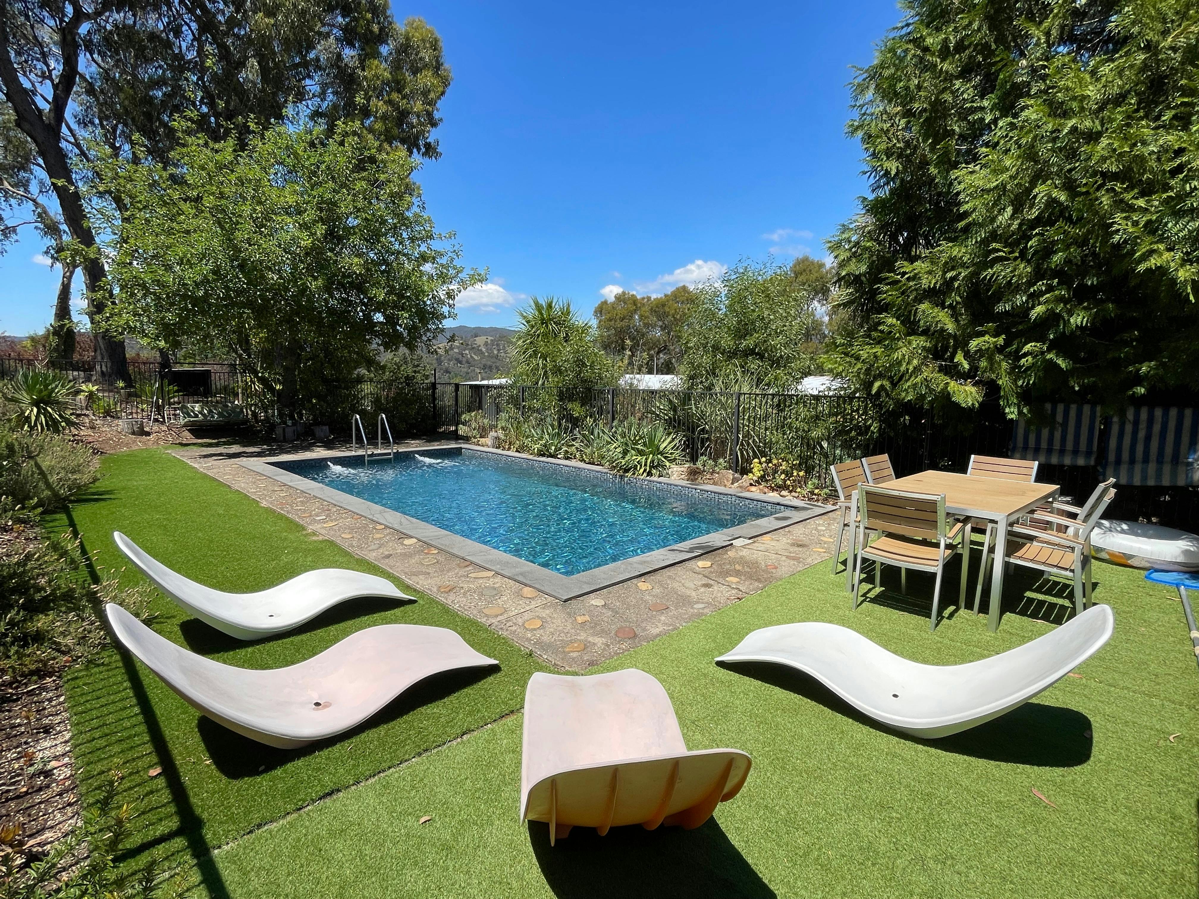 The home comprises a large living /dining area with a stone open fireplace. There are three master suites all with ensuite and queen size beds , one including a single and a rollaway, accommodation for eight guests in total with all linen and towels provided, all commercially laundered. Outside north facing terrace with pizza oven, rear yard with solar heated swimming pool, barbecue and children's play equipment including trampoline. Come and enjoy Eildon in Northeast Victoria, in any season for any reason.